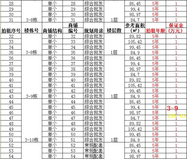 (二)拍租二個(gè)及其以上合并為一個(gè)商鋪6間,使用期5年,每間商鋪預(yù)交競(jìng)租保證金2萬(wàn)元至3萬(wàn)元不等,詳見(jiàn)商鋪簡(jiǎn)介(欲競(jìng)租多間商鋪,保證金類(lèi)推)。
